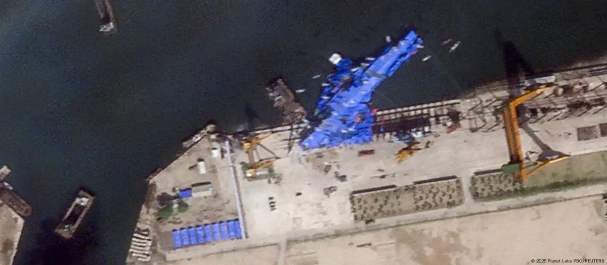 Las imágenes satelitales del lugar mostraron el buque volcado, con la mayor parte del casco sumergido y protegido con cubiertas azules.