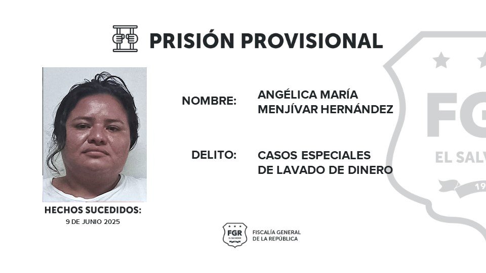 La Fiscalía General de la República (FGR) informó el miércoles que Angélica María Menjívar Hernández se mantenga en prisión mientras avanza la investigación en su contra por el delito de casos especiales de lavado de dinero.