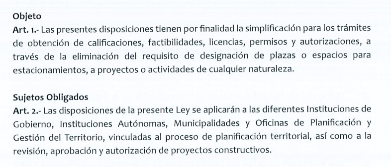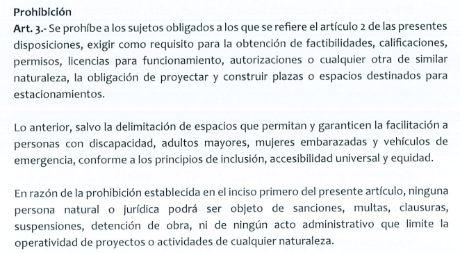 El anteproyecto también aclara que «ninguna persona natural o jurídica podrá ser objeto de sanciones, multas, clausuras, suspensiones, detención de obra, ni de ningún acto administrativo que limite la operatividad de proyectos o actividades de cualquier naturaleza» por no cumplir con el requisito de estacionamientos.