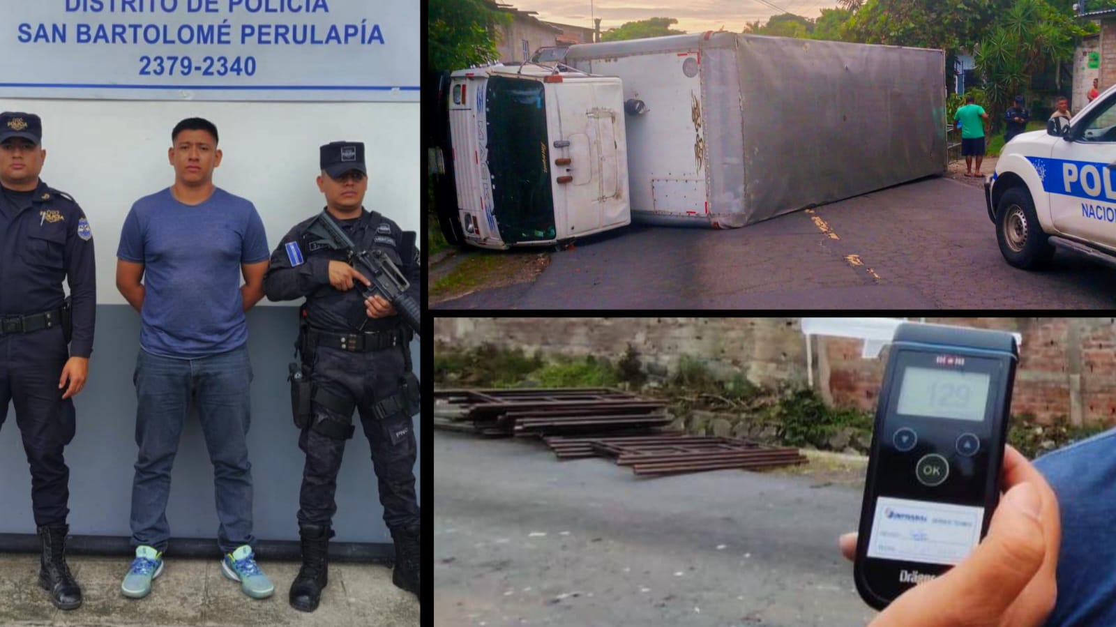 Un sujeto fue detenido este sábado por la Policía Nacional Civil (PNC) tras provocar un accidente de tránsito en el que resultó involucrado un camión que terminó volcado, sobre el kilómetro 21 ½ en el distrito de San Bartolomé Perulapía, Cuscatlán Norte.