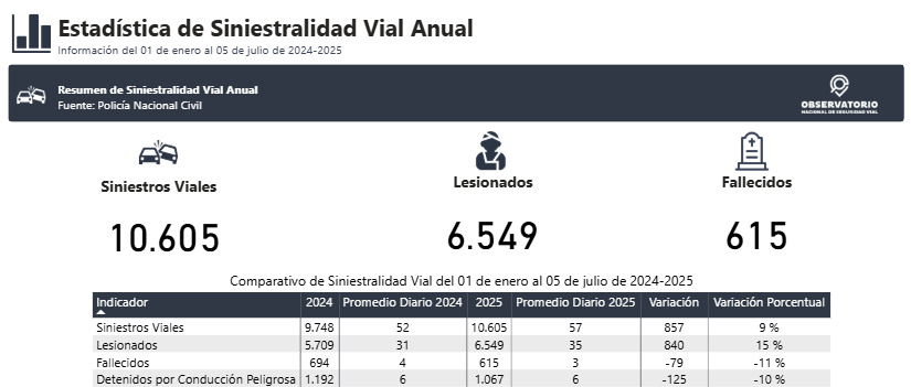 Un total de 10,605 siniestros viales se registraron en El Salvador entre el 1 de enero y el 5 de julio de 2025, que dejaron un saldo de 6,549 lesionados y 615 fallecidos, según datos del Observatorio Nacional de Seguridad Vial (ONASEVI).