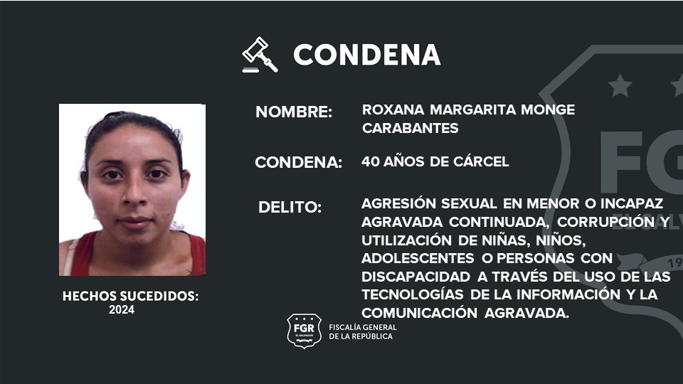 El Tribunal de Sentencia de Chalatenango condenó a 40 años de prisión a Roxana Margarita Monge Carabantes por agredir sexualmente a un menor de tres años de edad, hechos cometido en el barrio Las Flores, Chalatenango Sur, en 2024.