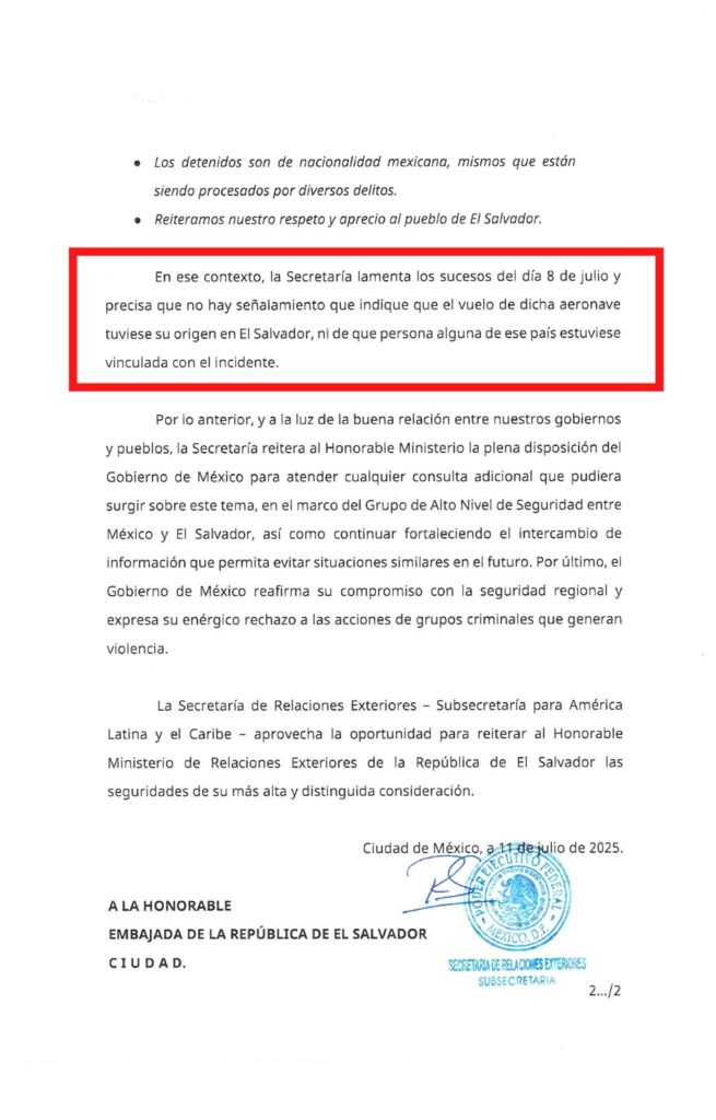 En un principio el Secretario de Seguridad y Protección Ciudadana de México, Omar García Harfuch, afirmó que la avioneta procedía de El Salvador, a lo que el Presidente de el salvador Nayib Bukele respondió de forma contundente a través de sus redes sociales, calificando la afirmación de «FALSO.