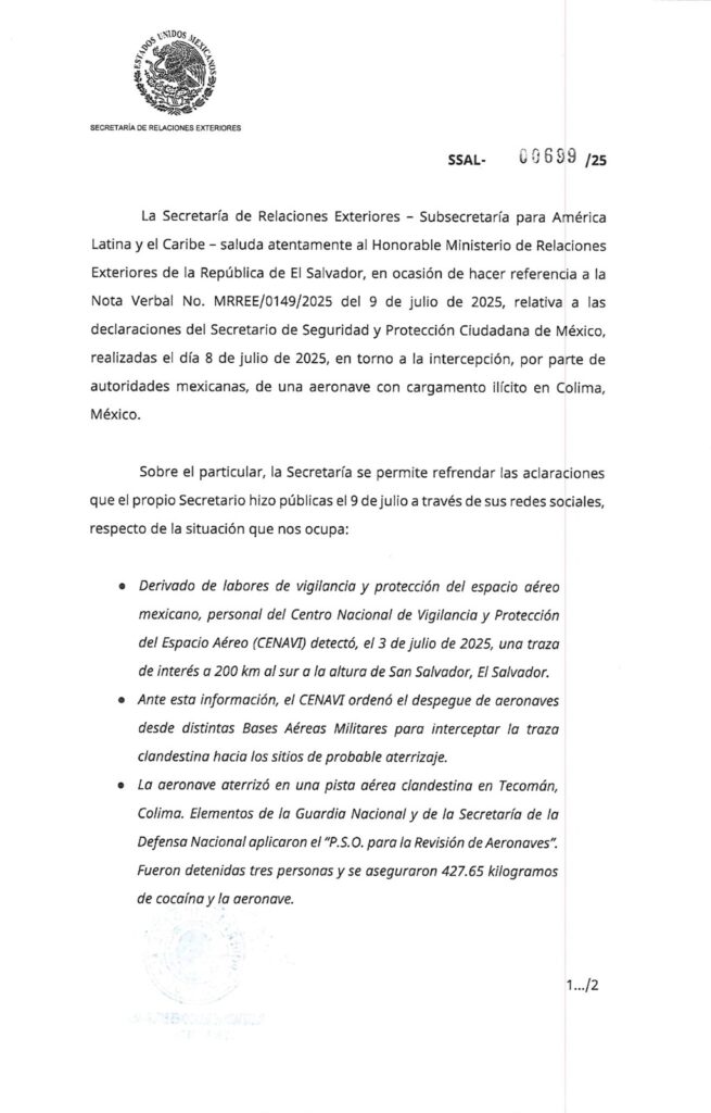 México aclara que aeronave interceptada con drogas no provenía de El Salvador: «Ni de que persona alguna de ese país estuviese vinculada con el incidente»