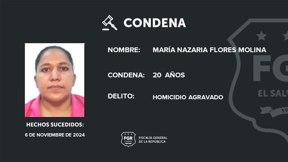 María Flores fue sentenciada a 20 años de prisión por el homicidio de una odontóloga ocurrido en noviembre de 2024, según informó este lunes la Fiscalía General de la República (FGR).