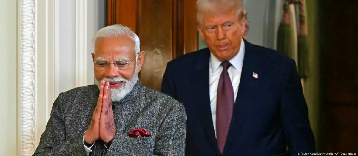 El primer ministro indio, Narendra Modi, saluda con las palmas de las manos juntas mientras entra en la Sala Este de la Casa Blanca seguido de Donald Trump, con gesto rígido, para dar una conferencia de prensa el pasado 13 de febrero. Foto: Cortesía.