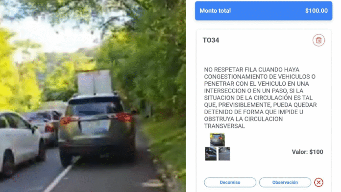 El Viceministerio de Transporte (VMT) impuso una multa de $100 al conductor del vehículo placas P 339BC por no respetar la fila vehicular durante un congestionamiento.