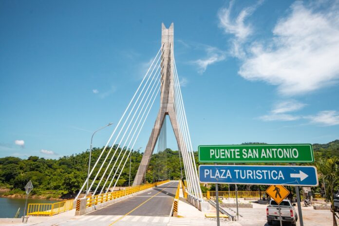 El puente San Antonio tiene una longitud de 157 metros y cuenta con dos carriles para tránsito vehicular y aceras peatonales separadas y protegidas.