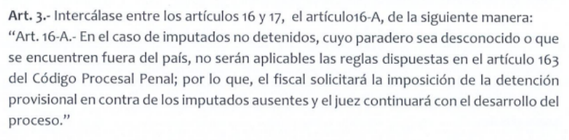 También se introduce un nuevo artículo que permitiría continuar los procesos contra imputados no localizados o que se encuentren fuera del país, habilitando a la Fiscalía para solicitar detención provisional y proseguir el caso sin su presencia.