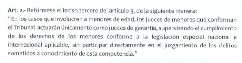 Las reformas plantean que, en casos con menores de edad, los jueces especializados de menores actuarán únicamente como jueces de garantía, supervisando el respeto a los derechos de los menores, sin participar en el juzgamiento.