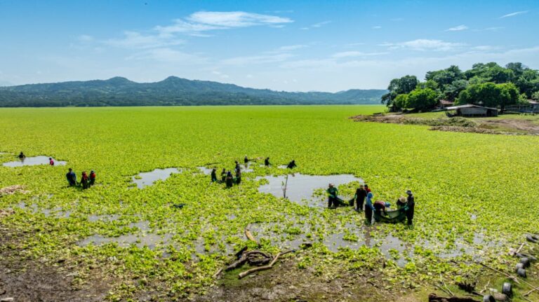Las labores de limpieza en el embalse Cerrón Grande, conocido como Lago Suchitlán, continúan con énfasis en la extracción manual y mecánica de la ninfa, especie acuática flotante cuya proliferación se ha incrementado este año.