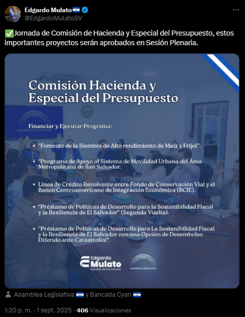 La Comisión de Hacienda de la Asamblea Legislativa emitió este lunes cinco dictámenes favorables relacionados con financiamiento externo y modificaciones al presupuesto, que permitirán fortalecer el transporte en el Área Metropolitana de San Salvador (AMSS), ampliar el mantenimiento vial, apoyar la producción agrícola y reforzar la sostenibilidad fiscal y la capacidad de respuesta ante desastres.