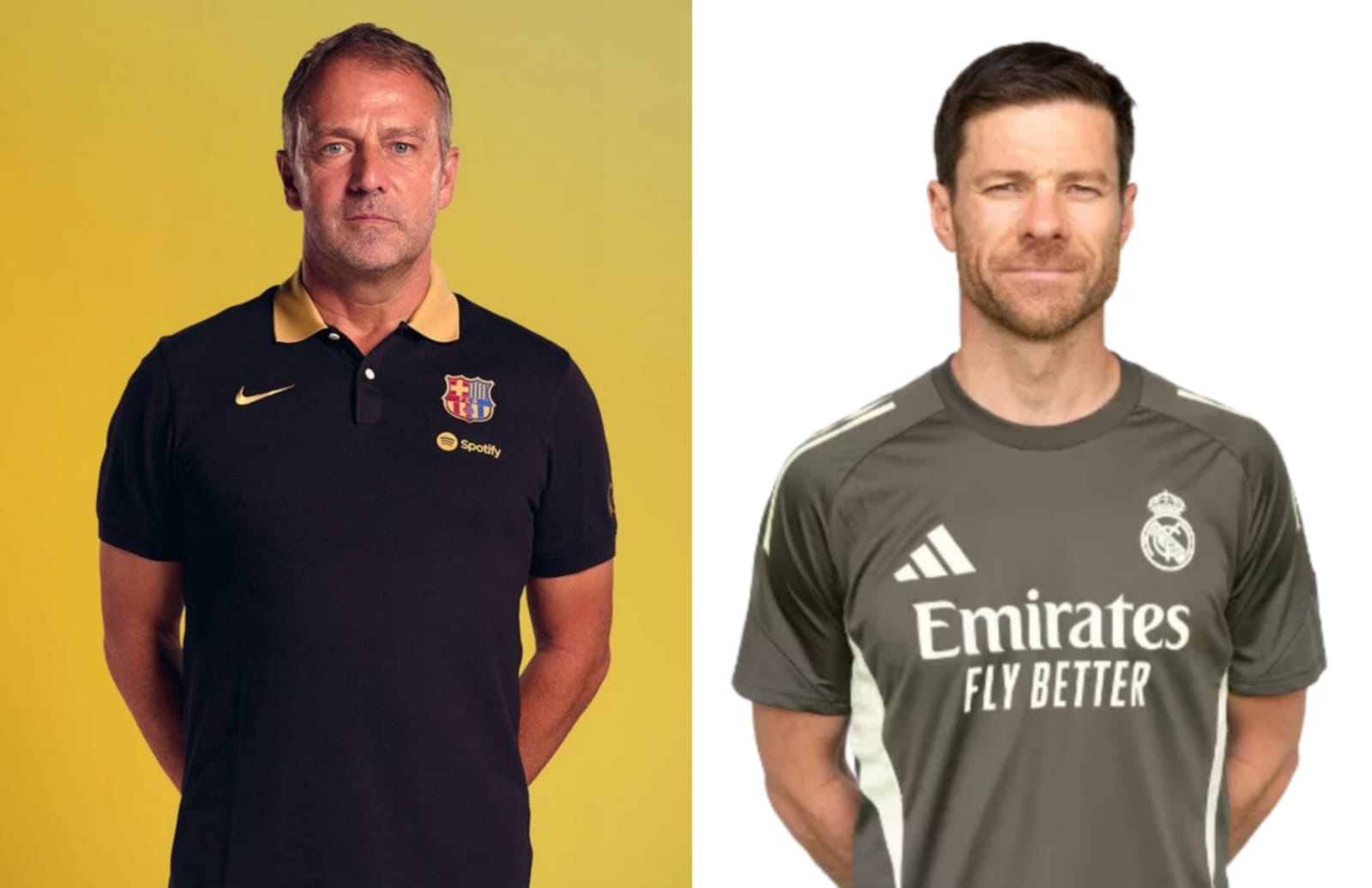 Será la primera temporada de Xabi Alonso al mando del conjunto "Blanco", la segunda del alemán, Hansi Flick con los "Blaugranas". Foto cortesía: FC Barcelona y Real Madrid.