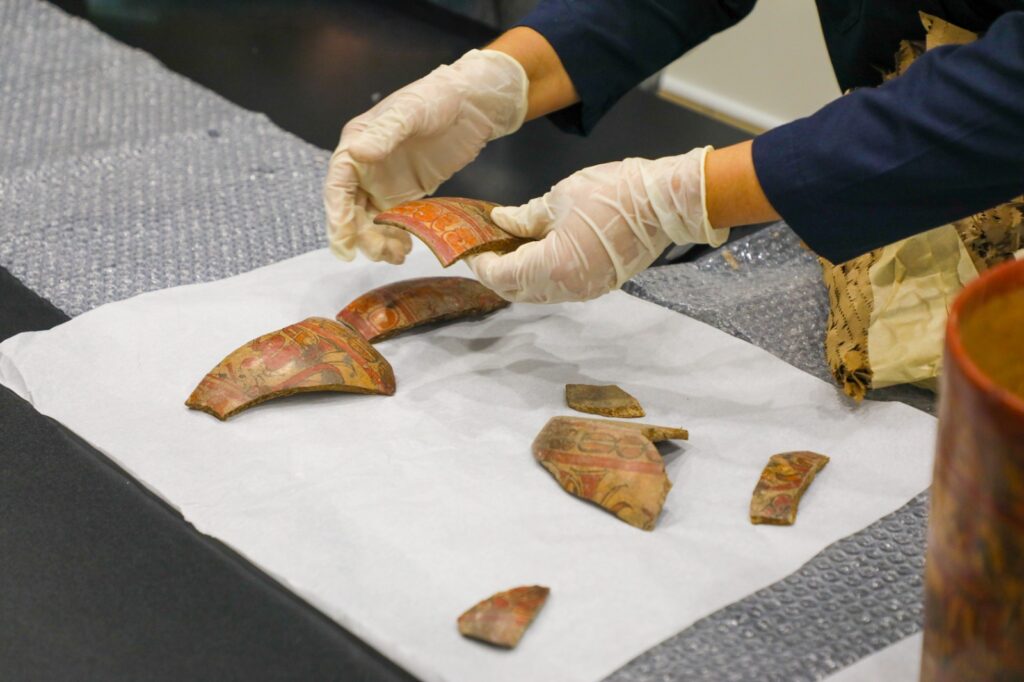 Las piezas incluyen elementos de cerámica y restos pintados en rojo y negro sobre fondo crema, que datan entre el año 100 y 1,000 d.C. Tras un análisis sobre su procedencia, se confirmó que son de origen prehispánico mesoamericano, específicamente de El Salvador.