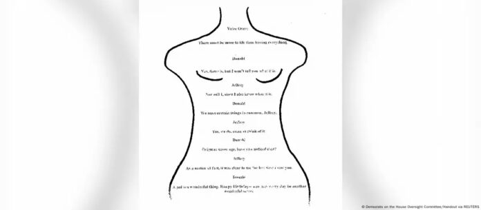 La que se le atribuye a Trump es una carta con un texto que recoge una conversación ficticia entre Trump y Epstein, rodeado por el dibujo de la silueta de una mujer desnuda e incluye una firma manuscrita con el nombre «Donald», muy similar a la rúbrica del presidente estadounidense.