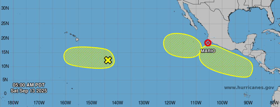 - Remanentes de la Tormenta Tropical Mario, ubicados a 130 kilómetros al suroeste de Manzanillo, México, moviéndose hacia el oeste-noroeste.