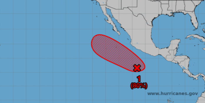 - Zona de baja presión (color rojo): al sur de las costas de México, con probabilidad de formación ciclónica del 60% en 48 horas y 80% en siete días, desplazándose hacia el oeste-noroeste cercano a la costa mexicana.