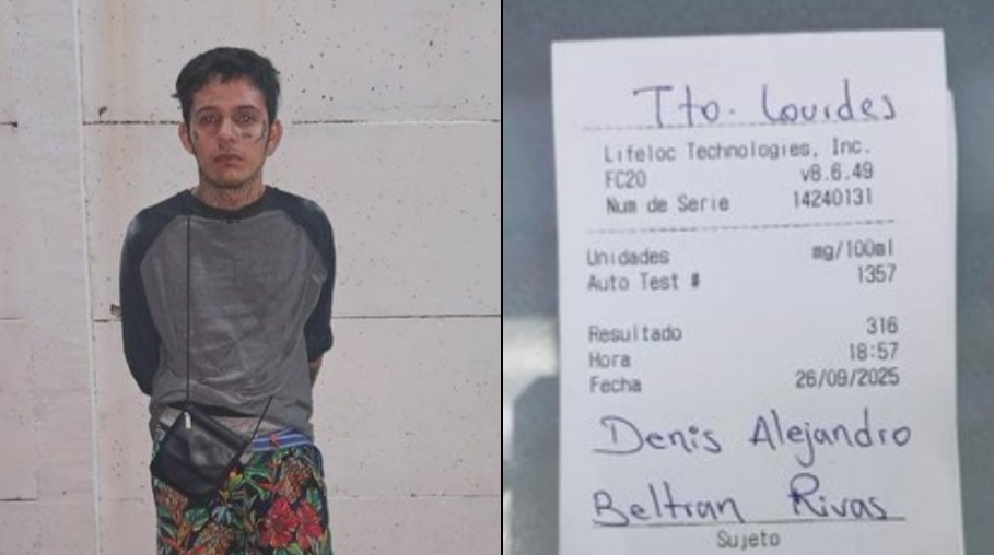 La Policía Nacional Civil (PNC) informó que el capturado es Denis Alejandro Beltrán Rivas, de 21 años, quien manejaba una motocicleta en estado de ebriedad.