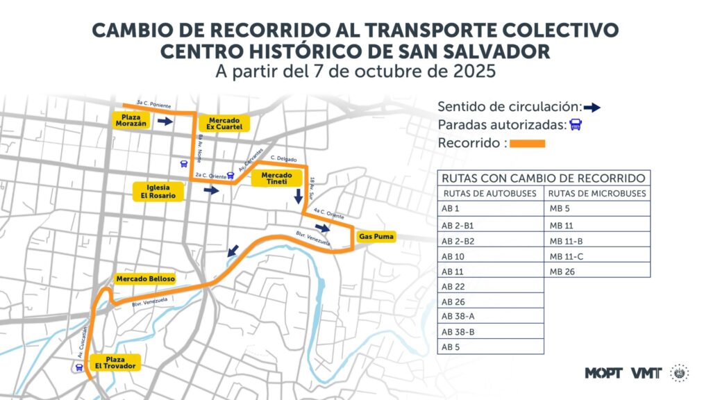 El Viceministerio de Transporte (VMT) ha anunciado este lunes que a partir de este martes 7 de octubre, se implementarán importantes cambios en los recorridos de varias rutas de autobuses y microbuses que transitan en el sentido norte a sur del Centro Histórico de San Salvador.