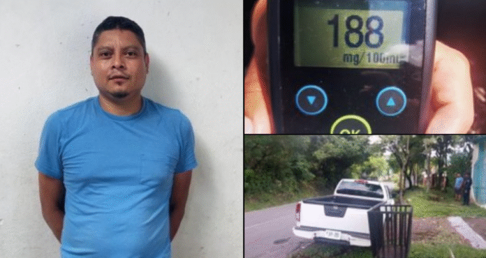 El detenido, identificado como José Reynaldo Argueta Blanco, de 40 años, manejaba un pick up con 188° de alcohol, cuando perdió el control del vehículo, se salió de la vía y quedó atascado en una cuneta.