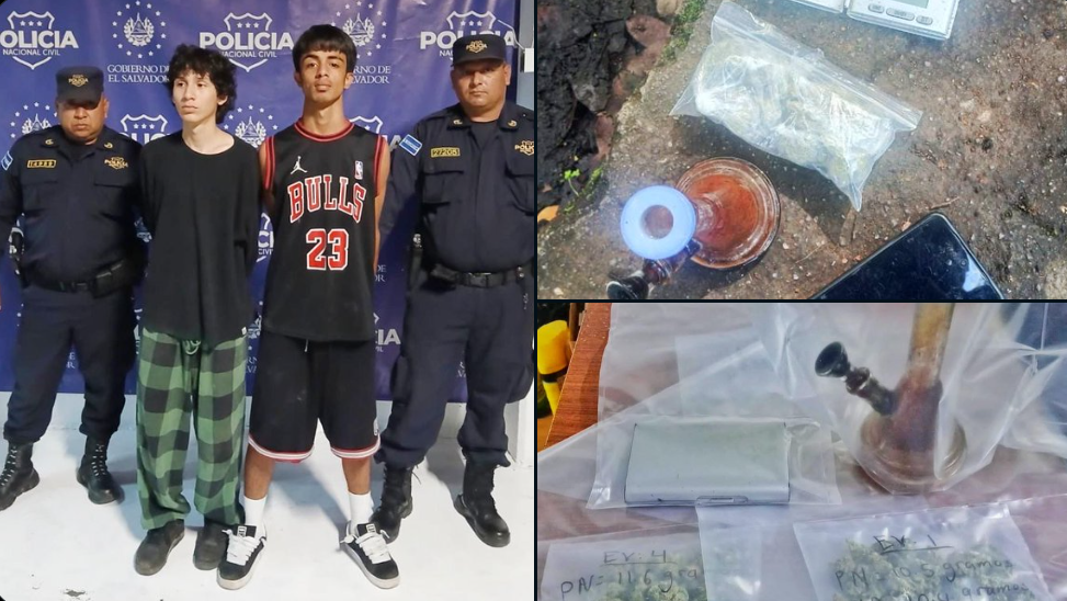 La Policía Nacional Civil (PNC) informa de la detención de dos sujetos, ambos de 18 años de edad, en posesión de marihuana y otros objetos relacionados con el narcomenudeo en el municipio de Santa Tecla.