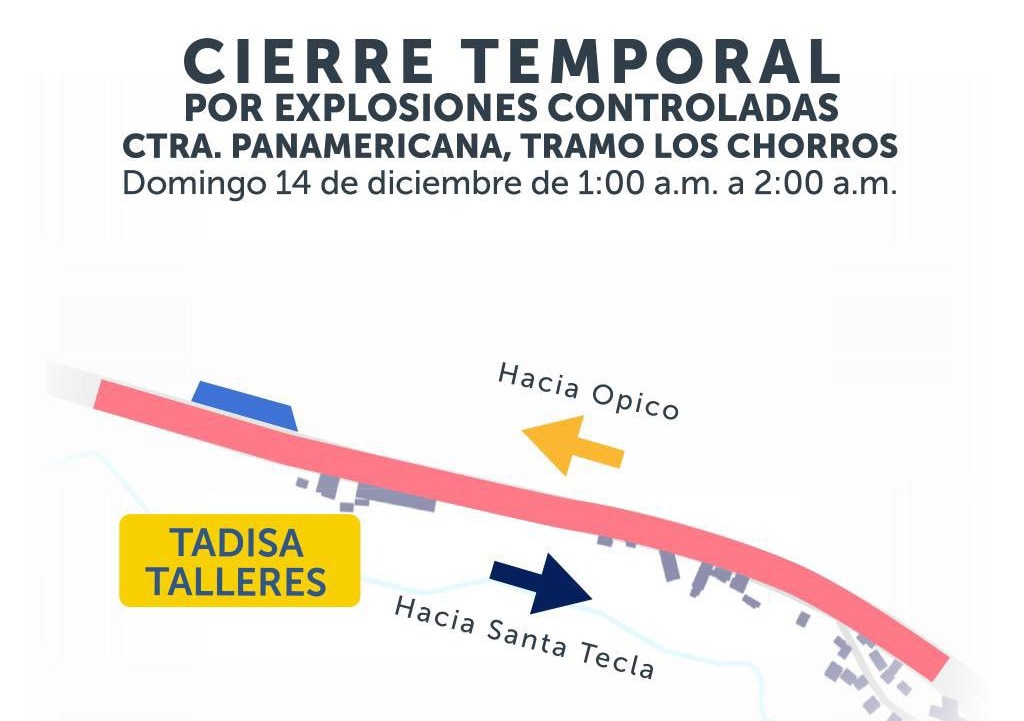 El titular de Obras Públicas, Romeo Rodríguez, informó en sus redes sociales, que la carretera Panamericana, en el tramo de Los Chorros, permanecerá cerrada temporalmente el domingo 14 de diciembre entre la 1:00 y 2:00 am, debido a la realización de explosiones controladas como parte de los trabajos en la zona.