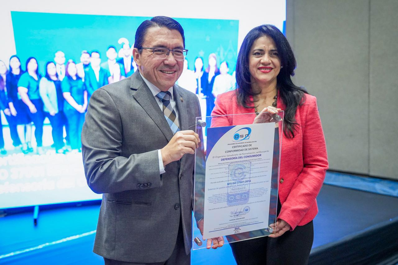 La Defensoría del Consumidor obtuvo la certificación de su Sistema de Gestión Antisoborno, alineado a la norma internacional NTS ISO 37001:2016, otorgada por el Organismo Salvadoreño de Normalización (OSN), como parte de un proceso orientado a reforzar los controles institucionales y la prevención de prácticas irregulares.