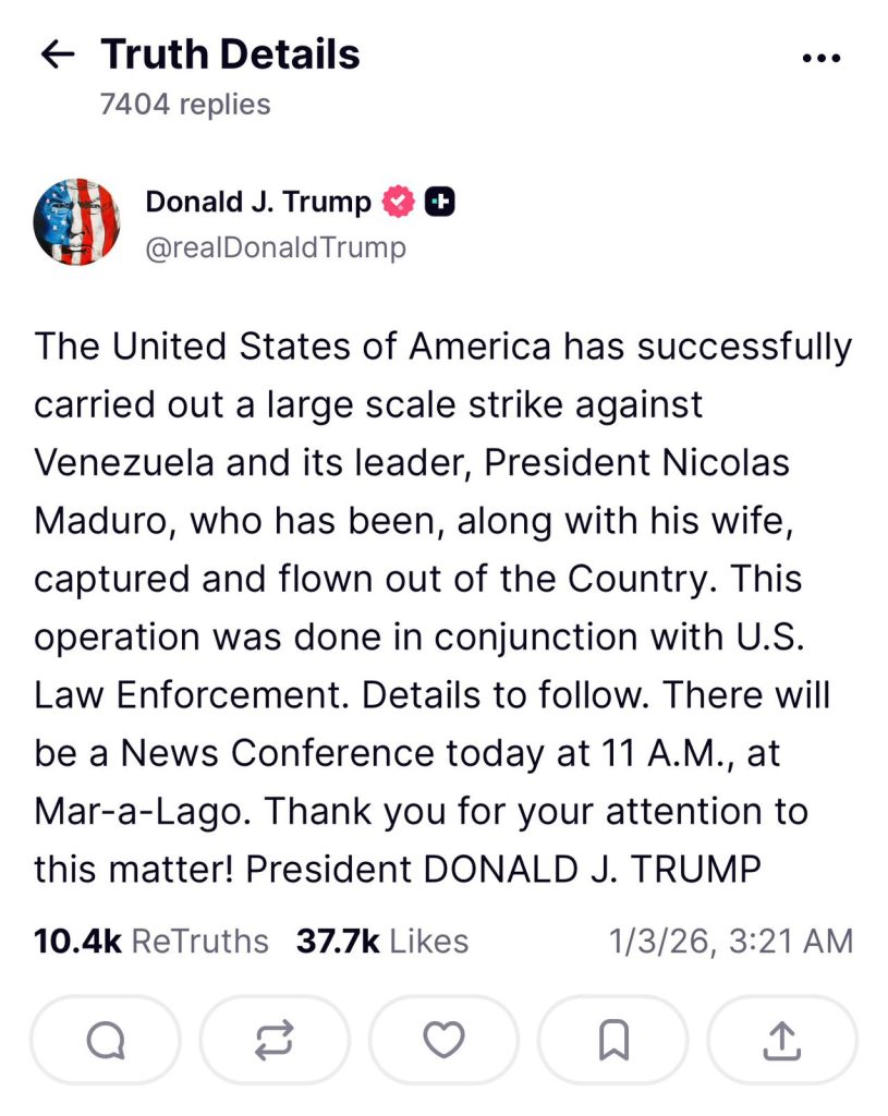 Trump hizo el anuncio en Truth Social, su plataforma en las redes sociales, y dijo que Estados Unidos había llevado a cabo “un ataque a gran escala contra Venezuela” en una operación que se realizó “junto con las fuerzas de seguridad estadounidenses”. Afirmó que Cilia Flores, la esposa de Maduro, también había sido capturada.