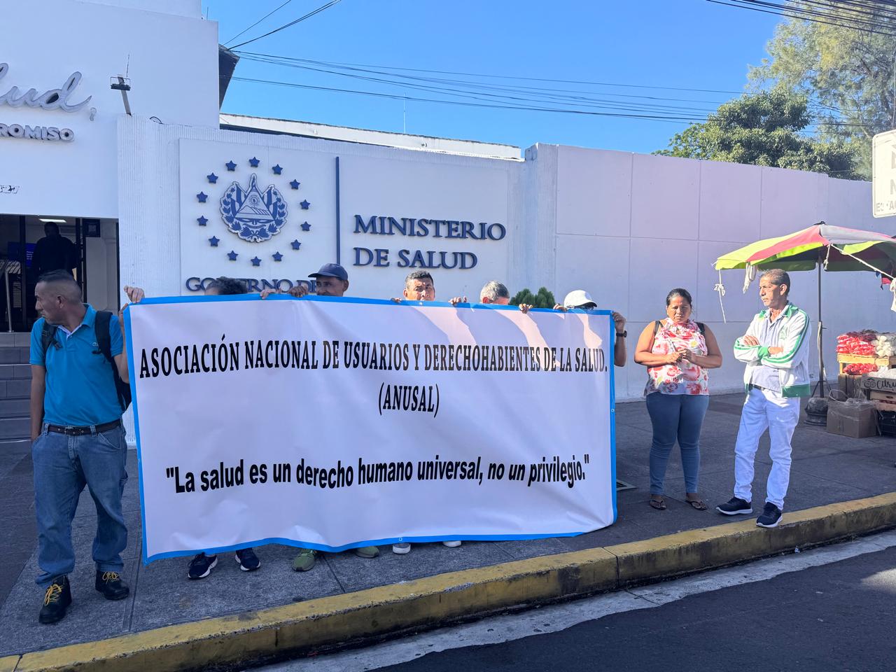 Representantes de la Asociación Nacional de Usuarios del Sistema de Salud Pública y del Instituto Salvadoreño del Seguro Social (ISSS) se manifestaron frente a las instalaciones del Ministerio de Salud, en la calle Arce de la capital, para señalar a la red hospitalaria del país, por supuesta falta de insumos médicos.