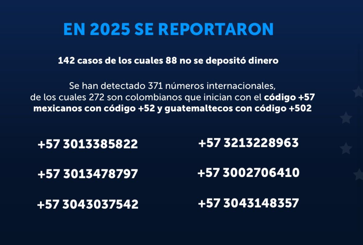 Villatoro indicó que las llamadas provienen principalmente de números con códigos internacionales, entre ellos 57 (Colombia), 52 (México) y 502 (Guatemala), y aseguró que no existe evidencia de daño físico a las personas afectadas.