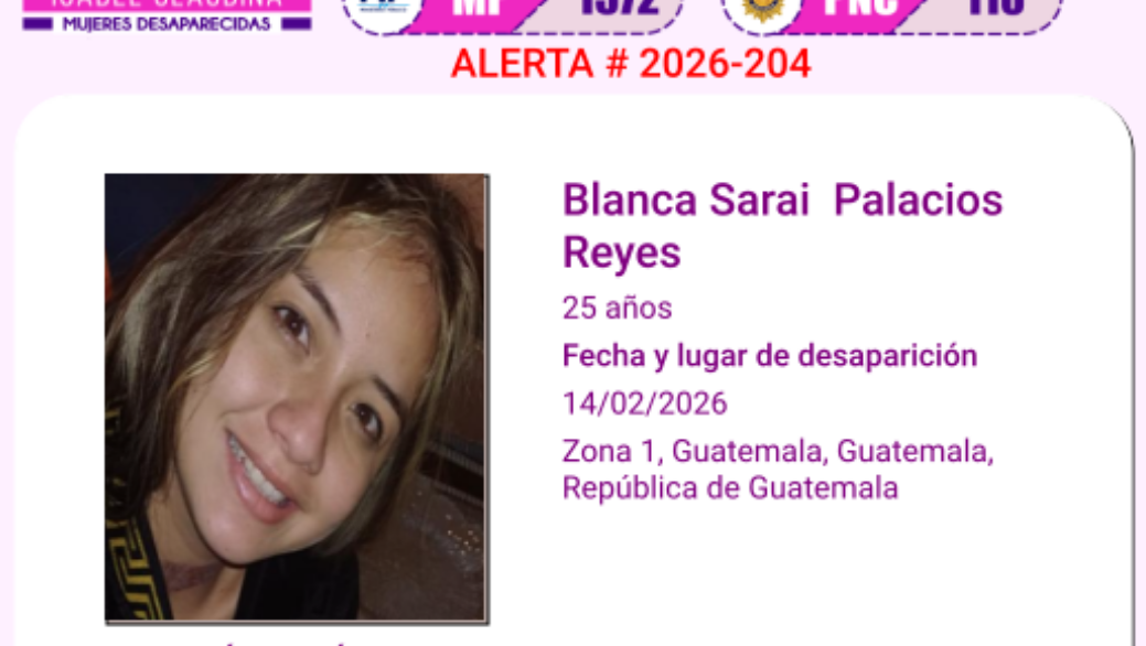 El Ministerio Público de Guatemala activó el 18 de febrero la alerta de búsqueda “Isabel Claudina”, indicando que la desaparición de Blanca Saraí Palacios Reyes, de 25 años, fue reportada en la Zona 1 de la capital guatemalteca.