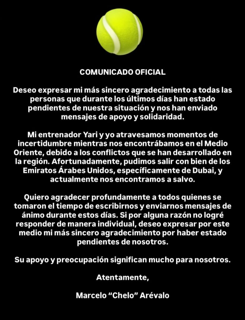De acuerdo al comunicado de Marcelo, vivieron momentos de mucha incertidumbre, pero finalmente lograron salir de Dubái y actualmente se encuentran a salvo. Este fue el comunicado que publicó el tenista en Instagram: