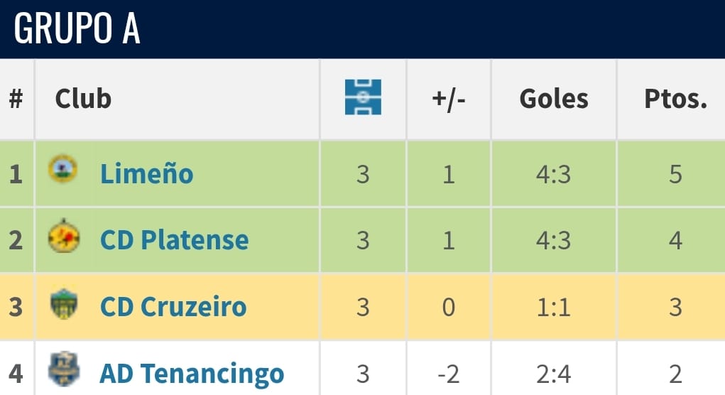En el Grupo A esta fue la tabla de posiciones, que dejó como clasificados a Municipal Limeño y Platense, con 5 y 4 puntos, respectivamente. Cruzeiro y Tenancingo quedaron fuera.