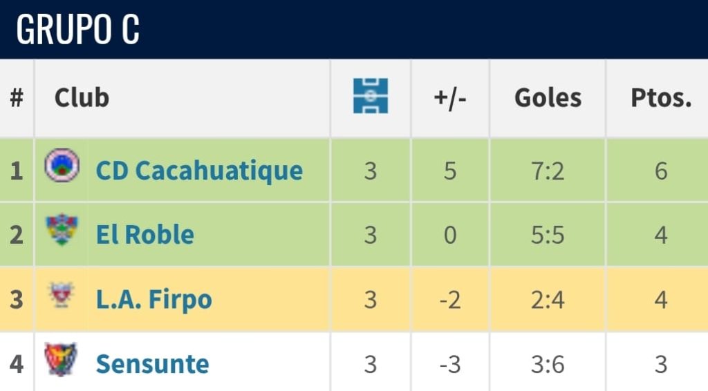 En el C avanzaron Cacahuatique y Roble con 6 y 4 puntos, respectivamente. En el tercer lugar quedó el vigente campeón de la Primera División, Luis Ángel Firpo, debido a una sanción por alineación indebida en la primera fecha contra Sensunte; los ‘Toros’ igual avanzaron con 4 unidades como uno de los mejores terceros.