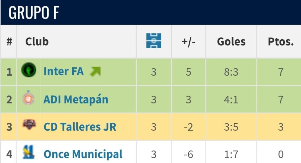 Por último, en el Grupo F, Inter y Metapán sumaron 7 puntos, pero los tecleños fueron líderes por la diferencia de goles. Talleres Jr se quedó con 3 puntos y no pudo meterse entre los mejores terceros.