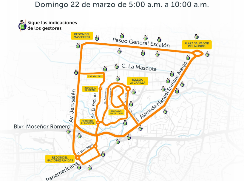 El Viceministerio de Transporte (VMT) informó que este domingo 22 de marzo se implementará un dispositivo de circulación vehicular controlada en sectores de las colonias Escalón y San Benito, debido a la realización de actividades deportivas.