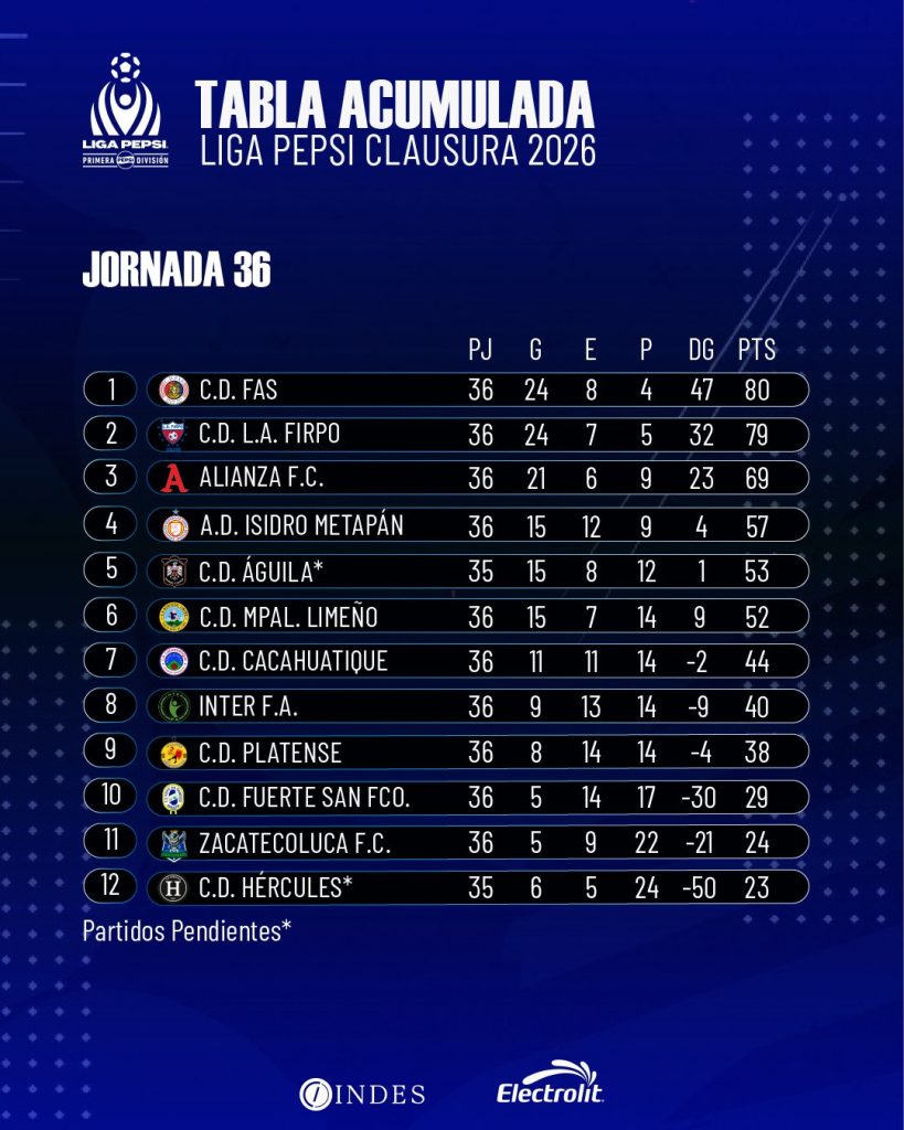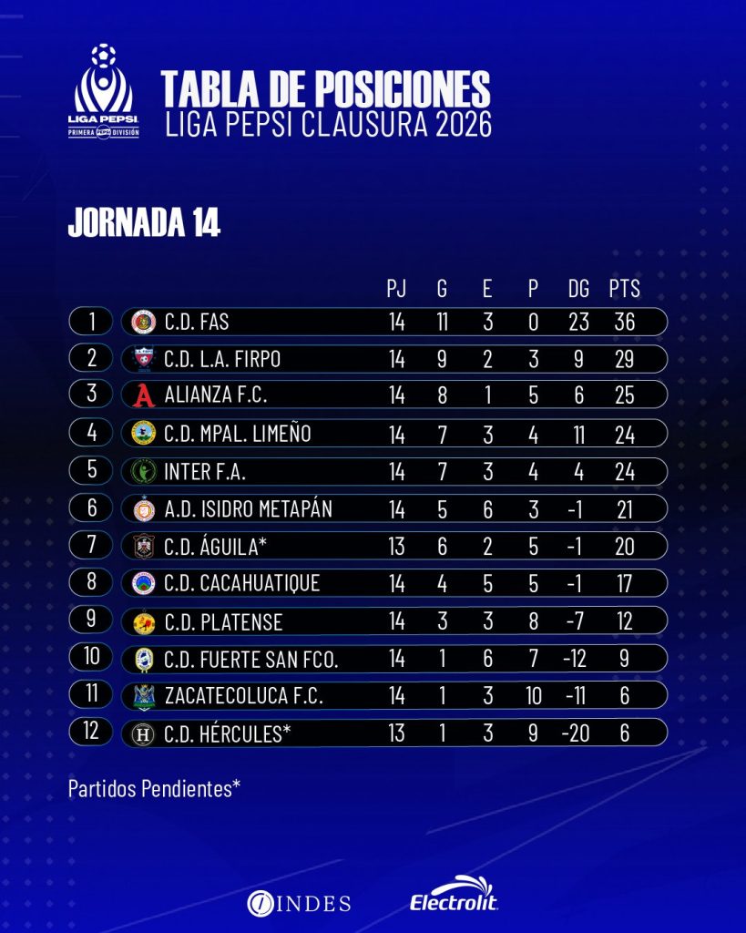 FAS venció 3-1 a Fuerte San Francisco, lo que reafirmó su papel como líder invicto y, además, extendió su distancia con Alianza en la acumulada, debido a que los ‘Albos’ cayeron en el Clásico Joven 2-1 ante Firpo. Los ‘Tigrillos’ mantienen una distancia de once puntos con los capitalinos, por lo que están muy cerca de asegurar un puesto en la Copa Centroamericana.