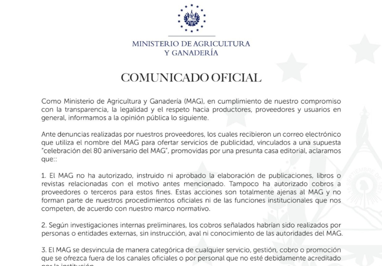 El Ministerio de Agricultura y Ganadería (MAG) emitió este día una alerta oficial dirigida a productores, proveedores y al público en general ante la detección de una red de estafas que utiliza el nombre de la institución de manera ilegal. La cartera de Estado informó que diversos proveedores han denunciado la recepción de correos electrónicos fraudulentos en los que se ofertan servicios de publicidad vinculados a una inexistente celebración del 80 aniversario del ministerio, promovida presuntamente por una casa editorial externa.