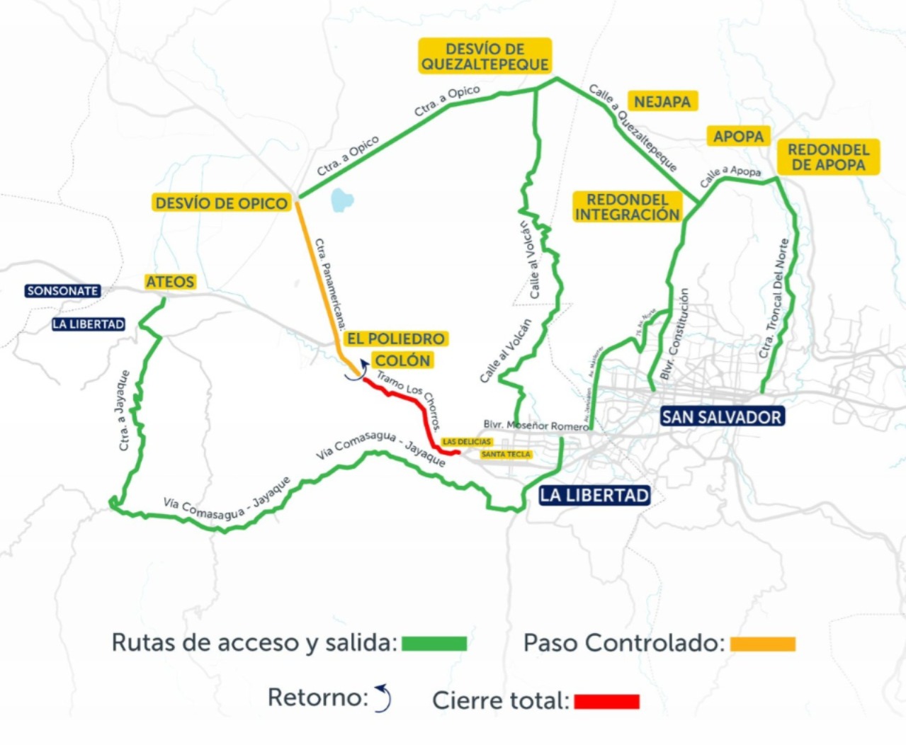 Las autoridades detallaron además que, si bien el cierre total será entre Las Delicias y Colón, se mantendrá un dispositivo de paso controlado en el tramo que conecta el Desvío de Opico con el sector de El Poliedro.