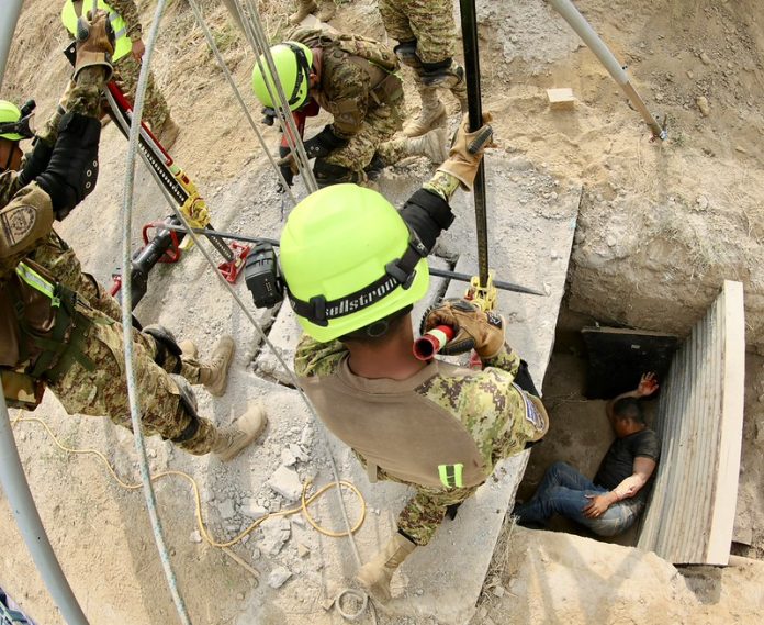 El simulacro incluye distintos módulos de rescate, entre ellos levantamiento manual de estructuras, corte de losas y estabilización de materiales, bajo condiciones que replican diversos tipos de construcción.