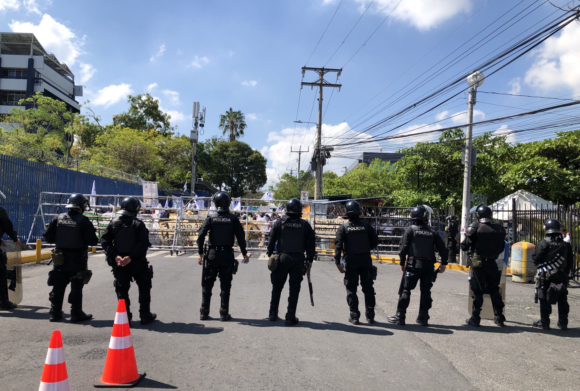 Policías aguardan en el portón sur de la Asamblea Legislativa, por marcha de ambientalistas que exigen derogar la Ley de Recursos Hídricos.