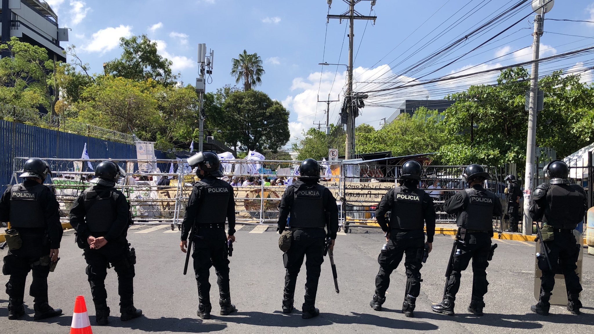 Policías aguardan en el portón sur de la Asamblea Legislativa, por marcha de ambientalistas que exigen derogar la Ley de Recursos Hídricos.